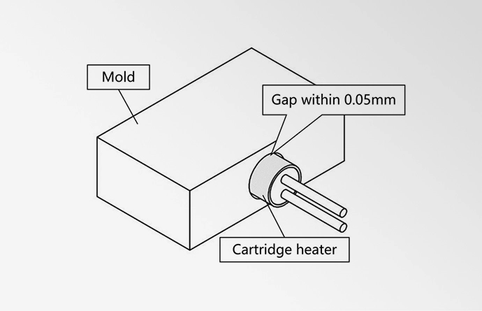 Note: For optimal heat transfer and longer heater life, please ensure high-power (high surface load) cartridge heaters fit closely within the installation hole. It’s important to minimize the gap between the heater and the installation hole within 0.1 mm.