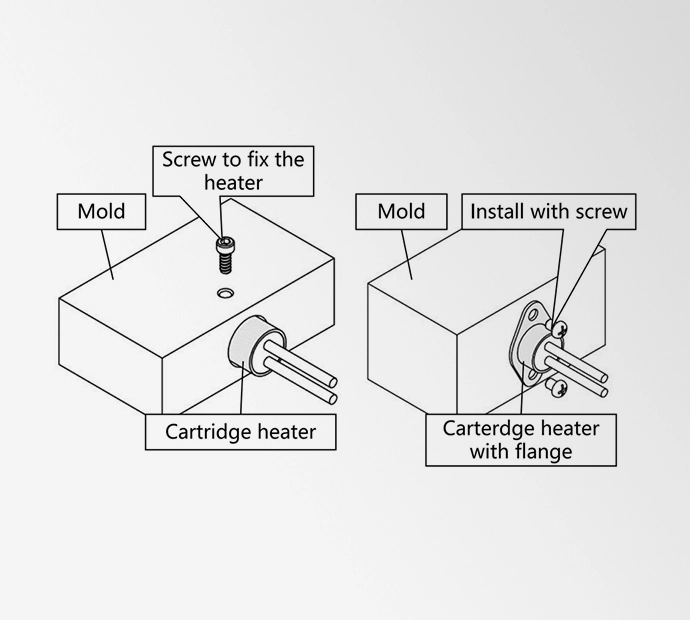 Reserve a mounting hole in the mold to accommodate the diameter of the cartridge heater (or customize the outer diameter of the heater to align with the existing hole size). It’s suggested to minimize the fit between heater and the mounting hole within 0.1mm.